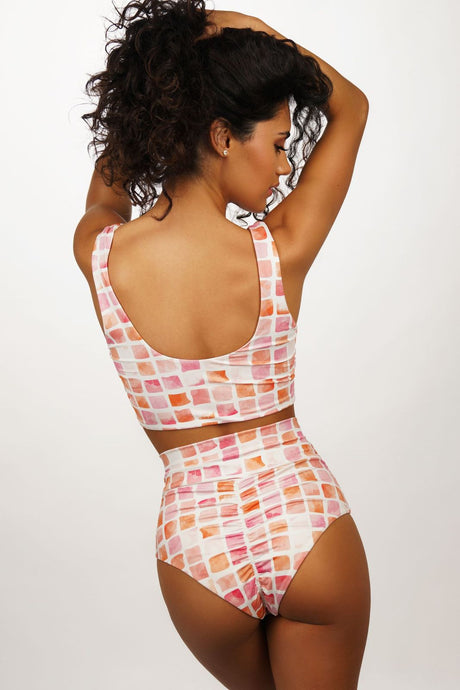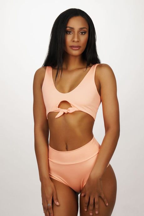 High waisted bathing suits work perfectly for tummy control for a relaxed slimming effect. If you are searching for bathing suits that make you look slimmer, these are the swimwear bottoms for you. Well-placed cutouts are an elegant choice to help define the waist. As apple body types usually have a smaller bust, a tube top or extra embellishment on the bikini top are ways to highlight this area and draw attention away from the bottom half. This assists to create balance to the frame for a slimming silhouette.